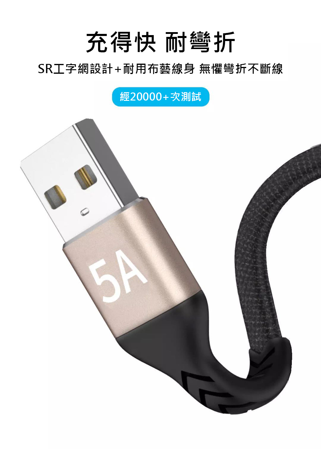 - 充電頭通過20000次摺曲測試,堅固耐用
