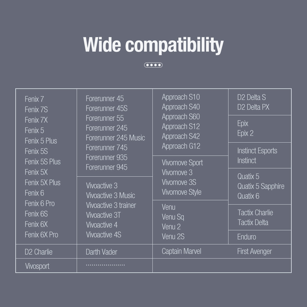 · 廣泛兼容大部份新舊款GARMIN手錶型號(請參考以下型號表)