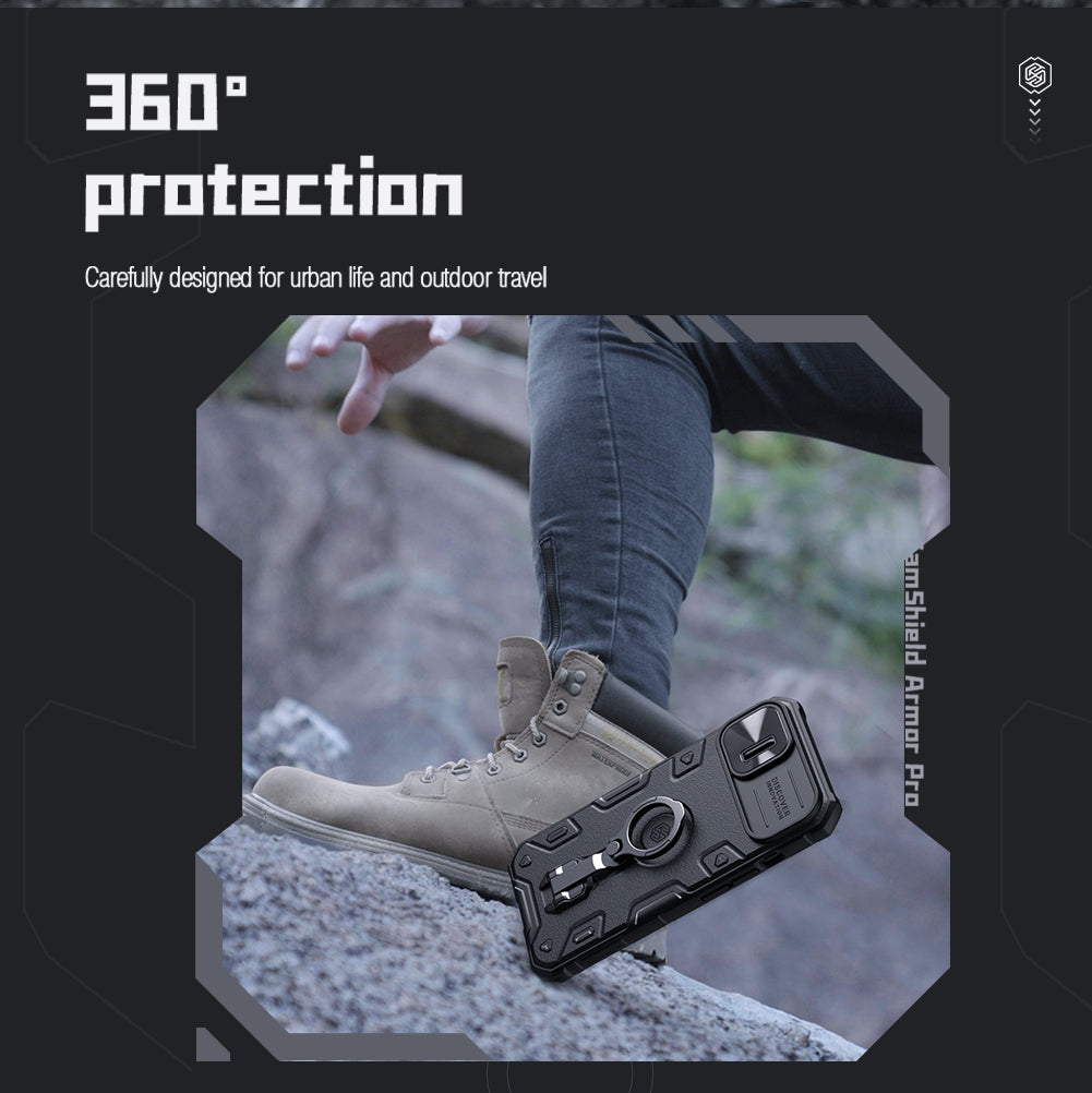 Nillkin iPhone 14/13 6.1" 通用MagSafe內置磁吸/鏡頭滑蓋/指環支架/四角氣囊升級防摔手機保護殼黑犀Pro系列